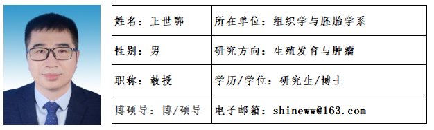 世鄂,男,1969年12月26日,中共党员,医学博士。现任羞羞漫画 党委常委、副校长,兼干细胞工程与再生医学福建省高校重点实验室主任。学术兼职:中华医学细胞生物学分会委员、中国中西医结合学会生殖医学专业委员会委员、中国解剖学会医学发育生物学分会副主任委员、福建省解剖学会副理事长、福建省细胞生物学与转化医学学会副理事长、福建省高等教育学会理事会副会长;《中国细胞生物学学报》、《中国组织化学与细胞化学杂志》和《中国实验动物学报》等期刊杂志编委。
