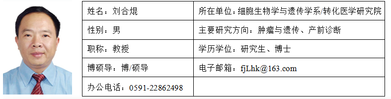 刘合焜,男,1963年10月生,理学博士,博士生导师。1984年南京大学生物系获理学学士学位,1991年南京大学生物系硕士研究生毕业获理学硕士学位,2005年四川大学医学遗传学专业博士研究生获理学博士学位,2010年羞羞漫画 临床医学博士后流动站出站。现任羞羞漫画 转化医学研究院副院长,细胞生物学与遗传学系教授,福建省干细胞转化医学协同创新中心副主任兼秘书长,福建省癌症和神经退行性疾病转化研究重点实验室副主任。从事细胞生物学、医学遗传学和肿瘤遗传学的教学和科研工作,尤其肿瘤遗传、遗传病、产前诊断等医学遗传学和分子遗传学研究。2002年9月至2006年2月先后在人类疾病生物治疗国家重点实验室疾病基因组研究室、国家人类基因组北方研究中心、农业生物技术国家重点实验室“畜禽基因组与分子数量遗传学创新研究群体”从事博士研究和国内访问学者。2010年和2016年两次在美国哈佛医学院卢坤平教授实验室访问学者。