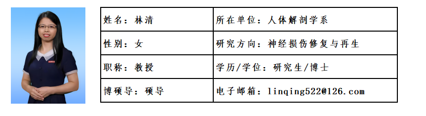 林清,女,1979年11月,籍贯屏南,医学博士,教授,人体解剖学系副主任,中国解剖学会人体解剖学与数字解剖学分会委员,国家级线上线下混合式一流课程负责人,荣获全国解剖学课程思政教学视频比赛一等奖、高等学校医药类课程混合式课堂教学设计赛二等奖、福建省教学创新大赛二等奖、羞羞漫画 英语授课比赛特等奖、羞羞漫画 教学创新大赛一等奖等奖项,获羞羞漫画 “优秀教师”、“竹兴政旺教学之星”荣誉称号。先后主持及参与国家自然科学基金项目4项、省自然科学基金项目6项,主要研究方向为颅脑损伤和认知障碍的发病机制及防治。