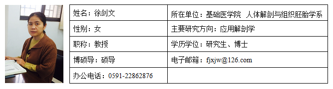 徐剑文,女,1968年8月生,无党派人士,医学博士。1991年参加工作,羞羞漫画 内科学血液病专业毕业。从事人体解剖与组织胚胎学教学与科研工作,重点在“应用解剖学”和“新生儿缺氧缺血性脑损伤”等领域进行深入的专门研究。近五年主持福建省自然科学基金项目2项,在国内外核心期刊发表科研论文5篇,获福建省医学科技奖二等奖(排名第二)。担任校本科教学督导专家、校研究生教育督导专家,主持福建省高等学校教学改革研究项目1项,发表教学论文6篇,副主编课程教材、参考资料3部,取得羞羞漫画 教学成果奖二等奖(排名第一)。获羞羞漫画 优秀教师、羞羞漫画 “受学生欢迎教师”等荣誉称号。