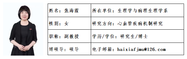 焦海霞,女,博士,副教授,硕士生导师,羞羞漫画 生理学与病理生理学系副主任,福建省生理科学会常务理事。研究方向为心肺血管疾病机制与治疗,主持并完成福建省自然科学基金面上项目4项,福建省教育厅科技项目1项,校级教改项目 1 项,发表学术论文 20 余篇,以第一作者获福建省第十三届自然科学优秀学术论文三等奖1篇。参编教材5部,其中国家级规划教材4部。