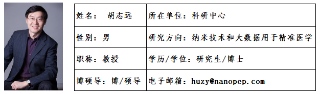 胡志远,1970.12民主工农党,博士。中国科学研究院“百人计划”国家纳米中心研究员,国家“万人计划”科技创业领军人才,北京市人民代表大会代表,福建省“百人计划”高层次人才2018年受聘我校),中国科学院大学中丹学院教授、博导。2012年获得中科院“引进国外杰出人才”择优支持。2016年入选“北京海外人才聚集工程”。任北京中科科技创新发展研究院健康科学研究中心主任,“肿瘤捕手”技术发明人,北京中科纳泰生物科技有限公司创始人兼董事长、中关村卓益慢病防治科技创新研究院(北京4P健康研究院)院长,北京蛋白质组国家重点实验室客座研究员,美国FDA医疗器械审评专家,美国临床肿瘤学会ASCO会员,中国CTC产业联盟理事长,中国抗癌协会CTC专家组组长中国抗癌协会肿瘤标志物检测技术及整合应用决策咨询专家队首批决策咨询专家北京医学检验学会常务理事。