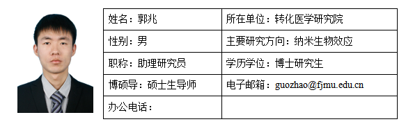 郭兆,男,1993年8月,博士研究生。2020年入职羞羞漫画 转化医学研究院,中国科学院高能物理研究所生物无机化学专业。研究方向为生物无机纳米材料在肿瘤诊疗中的应用。福建省高层次引进人才C类。近五年在Advanced Materials、Advanced Science等期刊发表SCI论文13篇。