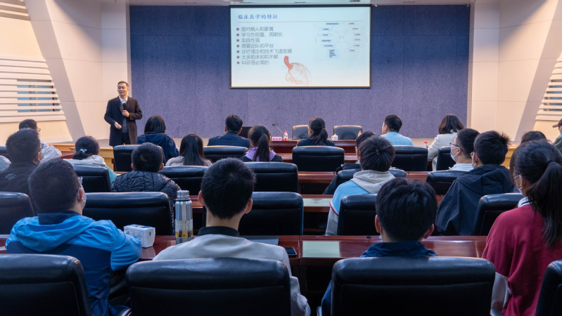柴大军教授全面分享了自身求学从医经历、临床医学专业学科特点、临床医生应具备的特质、科研在临床中的重要地位,并结合医学发展趋势和前景,鼓励同学们在学习中培养研究性的学习能力和科研思维,不局限于课本所学,拓宽医学视野,提升综合素养,努力成为卓越医学创新人才。现场互动环节中,同学们积极提问,柴大军教授结合自身的求学和工作经历耐心解答,最后勉励全体同学珍惜学习时光,不负伟大时代,不负青春之我。