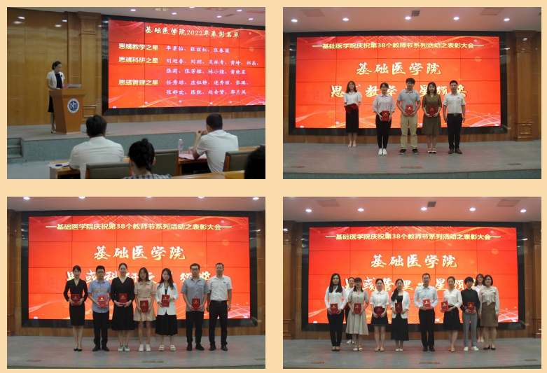 表彰大会由学院党委书记、副院长郭松斌主持。会上,学院院长、副书记陈婉南宣读了2022年学院“思彧”教学之星、“思彧”科研之星及“思彧”管理之星的表彰决定;与会领导为受表彰的教师代表颁奖;病理学系陈丽红教授作为教师代表发言。