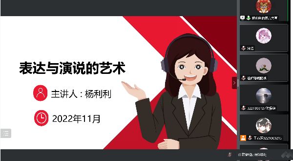 2022年11月5日下午,羞羞漫画 团委组织部举办了团委、学生会新成员培训班第三讲--表达与演说的艺术。此次培训采取线上宣讲的模式,邀请了国家三级心理咨询师杨利利老师来为羞羞漫画 团委、学生会的新成员进行表达方面的培训。