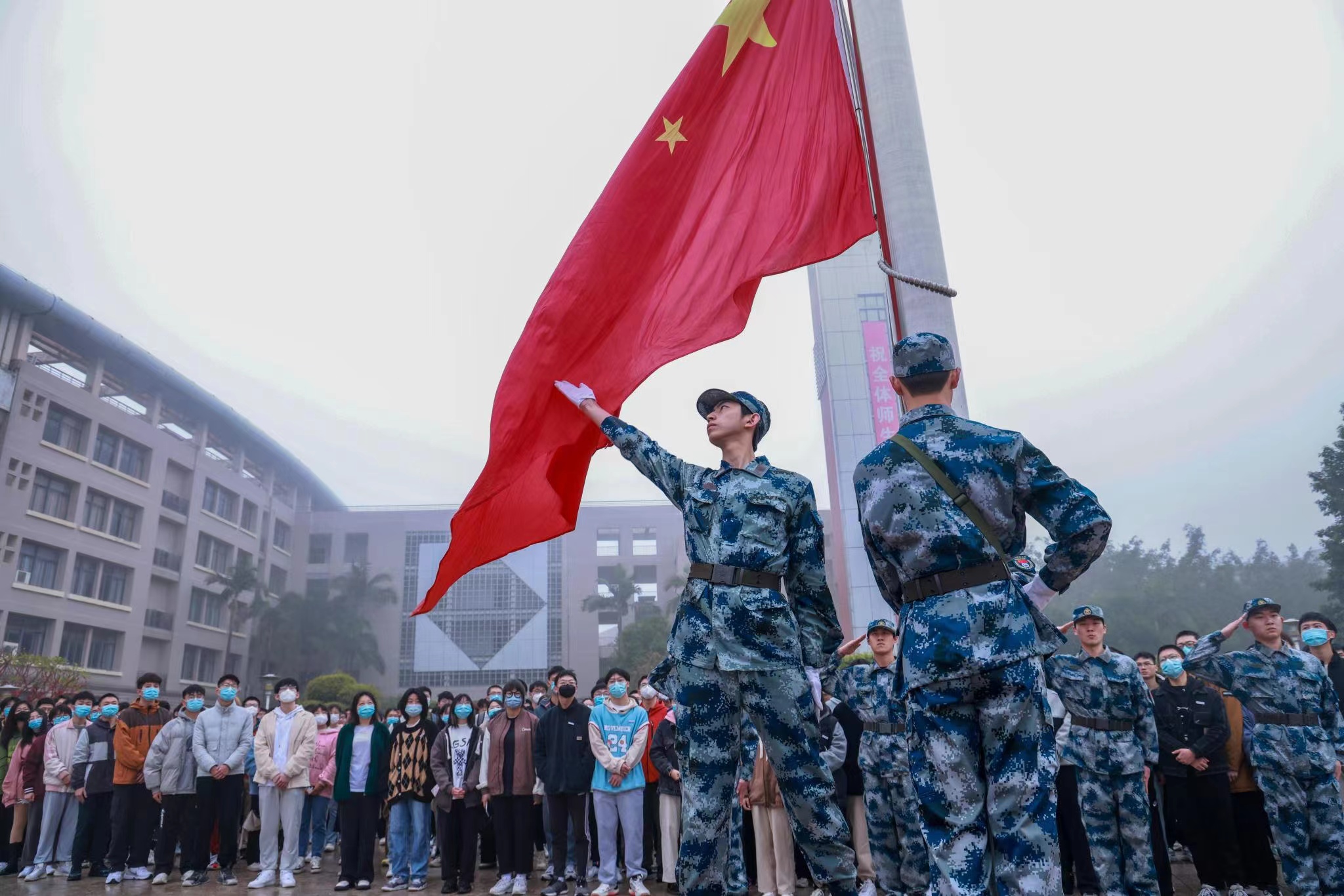 2月13日早上7:30,羞羞漫画 在福医广场举行庄严、隆重的升旗仪式,出席本次升旗仪式的有学院党政领导班子全体成员,学院党委委员,党政办和教科办负责人、党委组织员,参加仪式的还有全体辅导员、全体本科生和部分研究生代表。首先进行的是升国旗仪式。迎着晨曦的露水,在全体师生的注目礼下,英姿飒爽的国旗护卫队队员们护送鲜艳的五星红旗进场,伴随着庄严的《中华人民共和国国歌》,五星红旗冉冉升起,迎风飘扬。