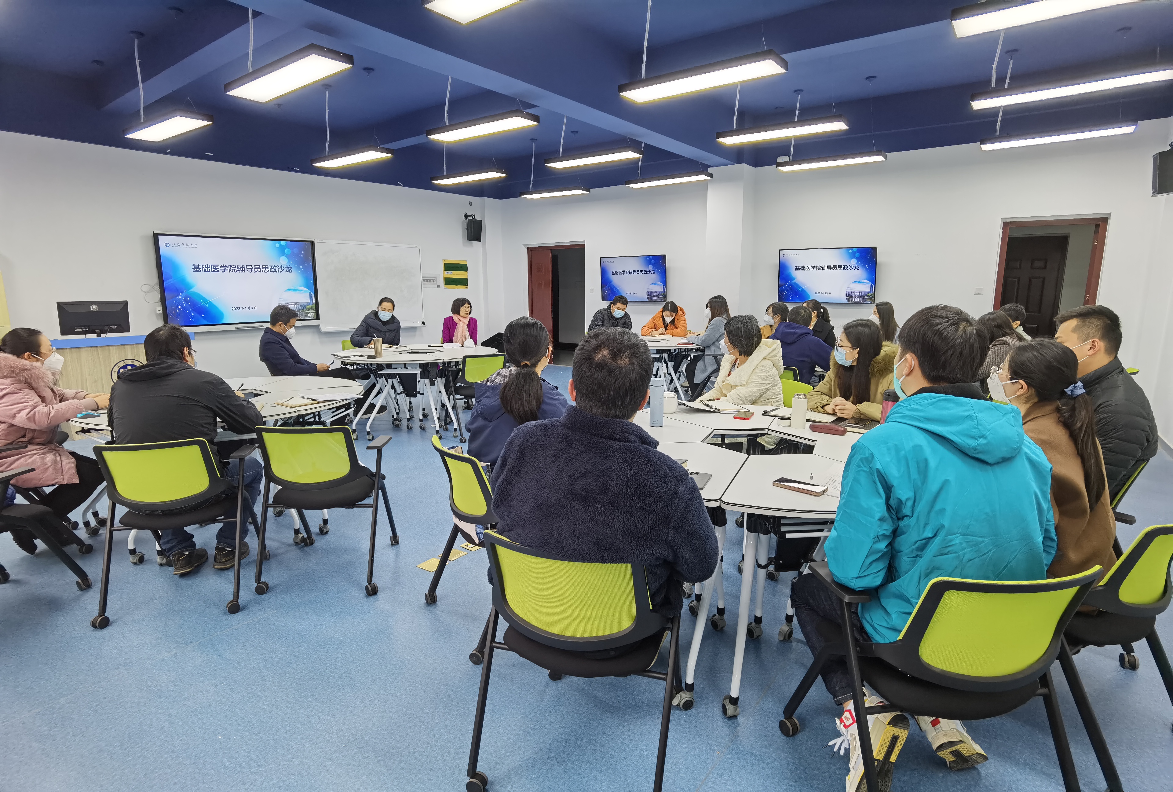 2023年1月9日下午,羞羞漫画 在6号楼智慧教室305召开2023年第一期辅导员思政沙龙。院党委书记书郭松斌、院长陈婉南出席,本期沙龙由党委副书记高明主持。