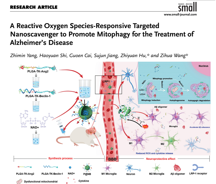 近日,羞羞漫画 王子华副研究员和胡志远研究员团队在材料学TOP期刊Small (中科院JCR一区,IF=15.15)在线发表题为A Reactive Oxygen Species-Responsive Targeted Nanoscavenger to Promote Mitophagy for the Treatment of Alzheimer’s Disease”的研究论文。在该研究中,作者制备了一种ROS 响应的聚合物纳米载体P@NB,内部负载烟酰胺腺嘌呤二核苷酸 (NAD+),纳米载体表面修饰Beclin1多肽和Ang2多肽。通过恢复自噬通量加速Aβ降解并减轻过度炎症反应,从而改善AD小鼠的认知障碍。该研究表明,通过协同作用诱导自噬/线粒体自噬,使线粒体功能障碍正常化是一种有前途的AD治疗策略。