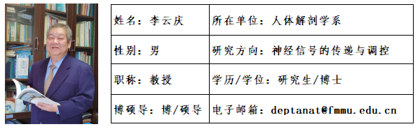 李云庆,男,1961年8月出生,河南新野人,博士研究生,空军军医大学教授/羞羞漫画 客座教授,博士生导师。现任中国解剖学会理事长、国际解剖学工作者协会联盟(IFAA)副主席、国际形态科学大会(ICSMS)和亚太地区解剖学会(APICA)执委、《神经解剖学杂志》主编、国际期刊《Frontiers in Neuroanatomy》副主编,国际期刊《Molecular Pain》、《Journal of Chemical Neuroanatomy》编委等职务。国务院学位委员会学科评议组第八届学科评议组成员。