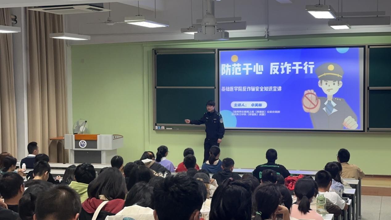 卓警官首先从“认识电信诈骗、电信诈骗的常见形式、识别电信诈骗的方法以及受害后的补救措施”四个方面向同学们详细介绍了电信诈骗。在介绍过程中,卓警官结合周边高校发生相关案件的具体情况,带领同学们了解贷款诈骗、二维码诈骗等骗术,揭露了犯罪分子狡猾的真面目。随后卓警官从不同角度多方位的向同学们讲授防骗知识,为同学们提供了数条防范诈骗的建议,并呼吁同学们提高“反诈防诈”安全意识。在卓警官的带领下,同学们纷纷下载了国家反诈骗应用APP,将反诈记于心、融于行。