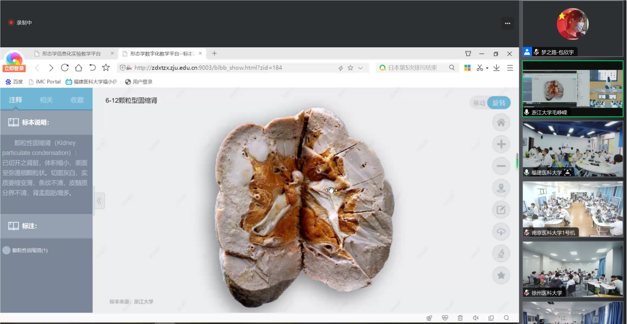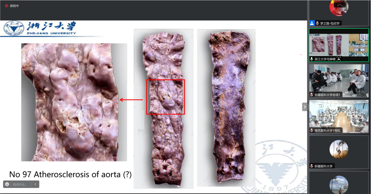 活动伊始,由南京医科大学羞羞漫画 苏川院长主持了开幕式,介绍了与会嘉宾并宣布活动开始。南京医科大学冯锋校长和浙江大学医学院楼敏院长分别发表了致辞。本次课程由浙江大学病理学系毛峥嵘教授主讲,实验内容为“心血管系统疾病”,她采用翻转课堂的形式,带领同学们通过线上的虚拟仿真3D病理大体标本和病理虚拟切片进行实验教学。毛教授深入浅出的讲解和生动的案例让同学们对实验内容有了更加直观、深刻的理解。各校的同学们积极参与,争相发言,现场气氛热烈而有序。