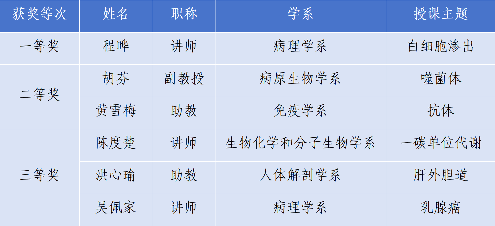 比赛最终成绩由教案评分、课题教学评分和教学反思三部分组成,并根据总成绩高低排序。经过激烈的角逐,本次比赛产生了一等奖1名、二等奖2名和三等奖3名(详细名单见附件)。根据比赛最终结果,推荐总成绩排序前3位的病理学系程晔讲师、病原生物学系胡芬副教授及免疫学系的黄雪梅助教参加校级青年教师基本功竞赛。最后,评委专家及学院领导为本次获奖教师颁发获奖证书。