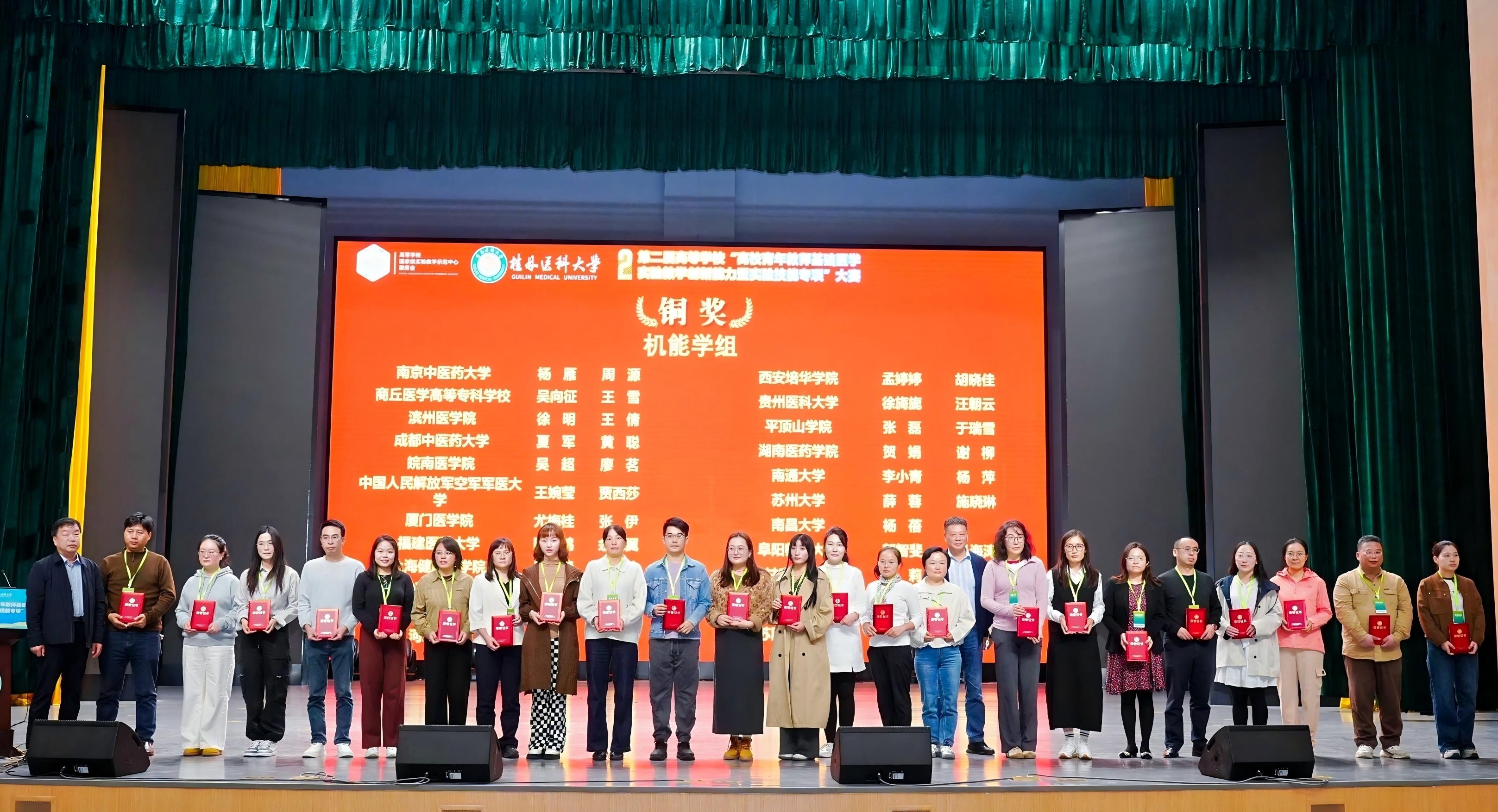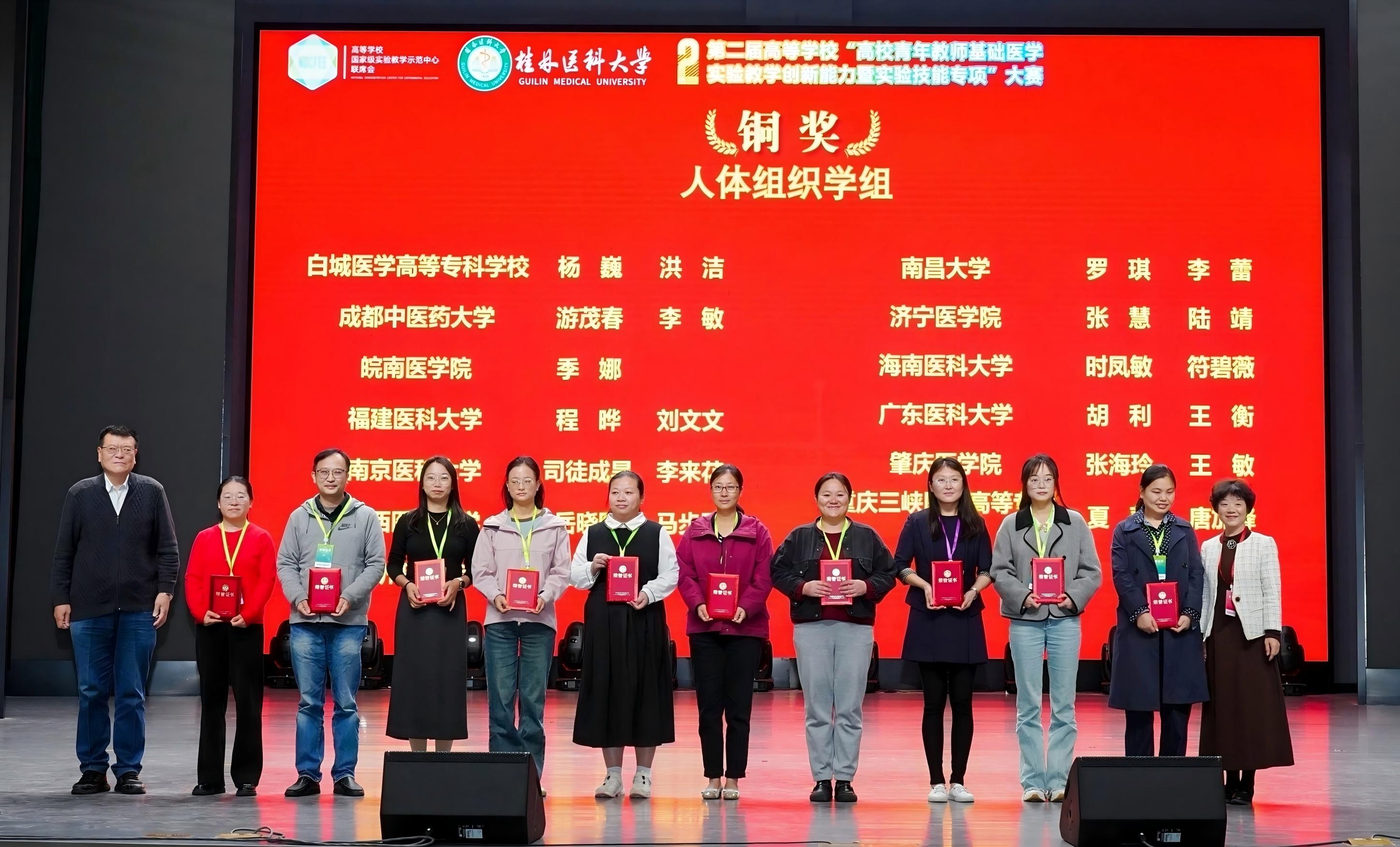 第二届高等学校“青年教师教学创新能力(基础医学实验技能专项)”总决赛10月25日在桂林医科大学举办,全国73所院校150支队伍参赛。羞羞漫画 病理学系程晔讲师、实验教学中心刘文文实验师、陈泽鸿实验师、余深翼助理实验师组成的两支代表队分别获“人体组织学组”、“机能学组”铜奖,展现了羞羞漫画 教师扎实的实验技能与创新的教学思路。学院将持续加强青年教师培养力度,推动教学质量进一步提升。